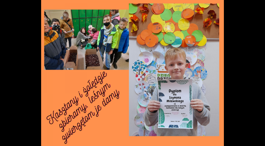 Nasza szkoła przystąpiła do akcji "Kasztany i żołędzie zbieramy, zimą leśnym zwierzętom je damy" którą organizowało Nadleśnictwo Dąbrowa. Akcja trwała do 16 listopada i spotkała się z dużym zainteresowaniem i zaangażowaniem uczniów i rodziców. Dziękujemy wszystkim, którzy postanowili wspomóc leśne zwierzęta w okresie zimowym. Na sczególne wyróżnienie zasłużył Szymon Milewski uczeń klasy VIB, który uzbierał rekordową ilość kasztanów. Gratulujemy zapału:)