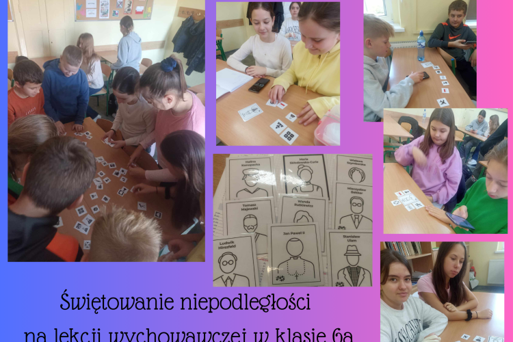 Świętowanie niepodległości na lekcji wychowawczej w klasie 6a. W formie zabawy poznawaliśmy postacie, które zapisały się w historii naszego kraju. Sportowcy, naukowcy, politycy, społecznicy otrzymywali ikonki ze swoimi dokonaniami. Zaangażowanie było ogromne.