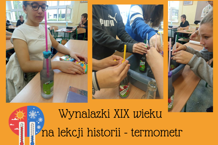 W czasie lekcji historii omawialiśmy wynalazki XIX wieku przy realizacji tematu rewolucja przemysłowa. Postanowiliśmy poczuć się jak odkrywcy i stworzyć termometr, który można wykorzystać do sprawdzenia temperatury w pomieszczeniu. Przydała nam się wiedza o stanach skupienia wody oraz rekwizyty: słomka, szklana butelka i plastelina. Jak widać lekcje historii mogą być ciekawe, każdy miał szansę wziąć udział w eksperymencie i stworzyć własny termometr.