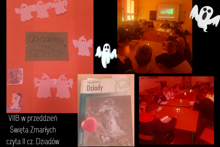 Klasa 7B w przeddzień Święta Zmarłych czyta II cz. Dziadów w ramach nietypowych i nieoczywistych lekcji języka polskiego.
