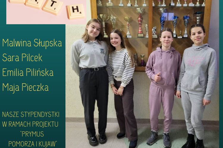 Malwina Słupska z klasy 8b, Sara Pilcek z klasy 8c, Emilia Pilińska oraz Maja Pieczka z klasy 8e to nasze matematyczne talenty, które w tym roku szkolnym otrzymały stypendium w ramach projektu "Prymus Pomorza i Kujaw". Gratulacje!!!