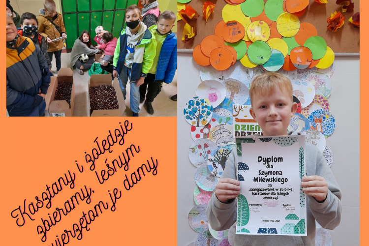 Nasza szkoła przystąpiła do akcji "Kasztany i żołędzie zbieramy, zimą leśnym zwierzętom je damy" którą organizowało Nadleśnictwo Dąbrowa. Akcja trwała do 16 listopada i spotkała się z dużym zainteresowaniem i zaangażowaniem uczniów i rodziców. Dziękujemy wszystkim, którzy postanowili wspomóc leśne zwierzęta w okresie zimowym. Na sczególne wyróżnienie zasłużył Szymon Milewski uczeń klasy VIB, który uzbierał rekordową ilość kasztanów. Gratulujemy zapału:)