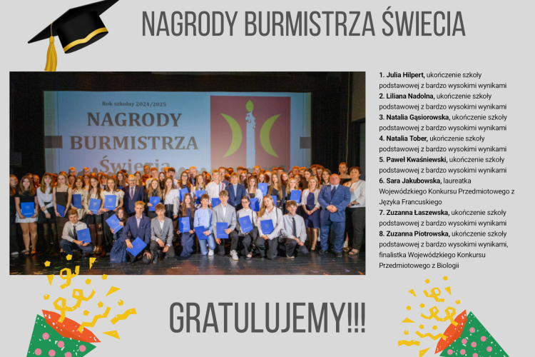 25 czerwca 2025 roku w Centrum Kultury w Świeciu zebrali się najlepsi absolwenci szkół podstawowych z gminy Świecie oraz uczniowie z klas szóstych i siódmych, którzy odnieśli sukcesy na arenie sportowej. Z naszej szkoły nagrody otrzymali: Julia Hilpert, Liliana Nadolna, Natalia Gąsiorowska, Natalia Tober, Paweł Kwaśniewski, Sara Jakubowski, Zuzanna Łaszewska, Zuzanna Piotrowska. Serdecznie gratulujemy i jesteśmy z Was dumni !!!