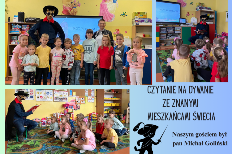 Podobnie jak w ubiegłym roku kontynuujemy cykl ,,Czytanie na dywanie ze znanymi mieszkańcami Świecia". Właśnie dziś oddział przedszkolny odwiedził pan Michał Goliński z Izby Regionalnej. Zachwycił dzieci pięknym strojem. Przebrał się za bohatera swojej ulubionej książki z dzieciństwa - Kota w butach. Serdecznie dziękujemy za wizytę:)