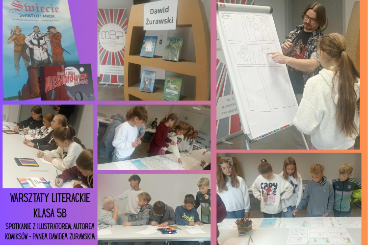 Uczniowie klasy 5b uczestniczyli w warsztatach literackich w bibliotece miejskiej pod czujnym okiem  pana Dawida Żurawskiego - ilustratora i autora komiksów. Bardzo dziękujemy za spotkanie.