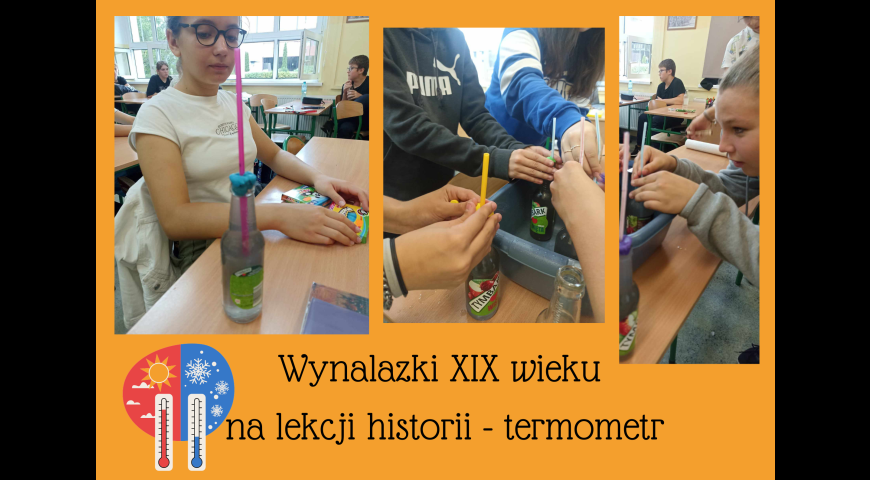 W czasie lekcji historii omawialiśmy wynalazki XIX wieku przy realizacji tematu rewolucja przemysłowa. Postanowiliśmy poczuć się jak odkrywcy i stworzyć termometr, który można wykorzystać do sprawdzenia temperatury w pomieszczeniu. Przydała nam się wiedza o stanach skupienia wody oraz rekwizyty: słomka, szklana butelka i plastelina. Jak widać lekcje historii mogą być ciekawe, każdy miał szansę wziąć udział w eksperymencie i stworzyć własny termometr.