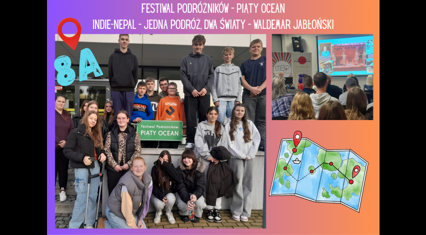 Uczniowie klasy 8a uczestniczyli w prelekcji podróżniczej w ramach Festiwalu Podróżników ,,Piąty Ocean" . Jej autorem był pan Waldemar Jabłoński, a tematem spotkania były Indie i Nepal. Serdecznie dziękujemy organizatorom za zaproszenie.