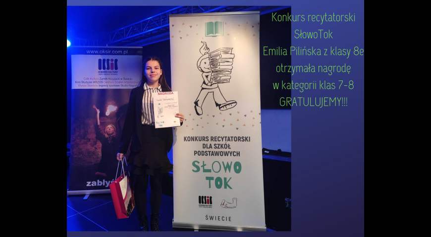 Konkurs recytatorski SłowoTok / Data publikacji: 29.11.22 / Dodane przez Magda Pogoda - 29.11.22 Emila Pilińska z klasy 8e otrzymała nagrodę w konkursie recytatorskim SłowoTok w kategorii klas 7-8. Serdecznie gratulujemy!!!