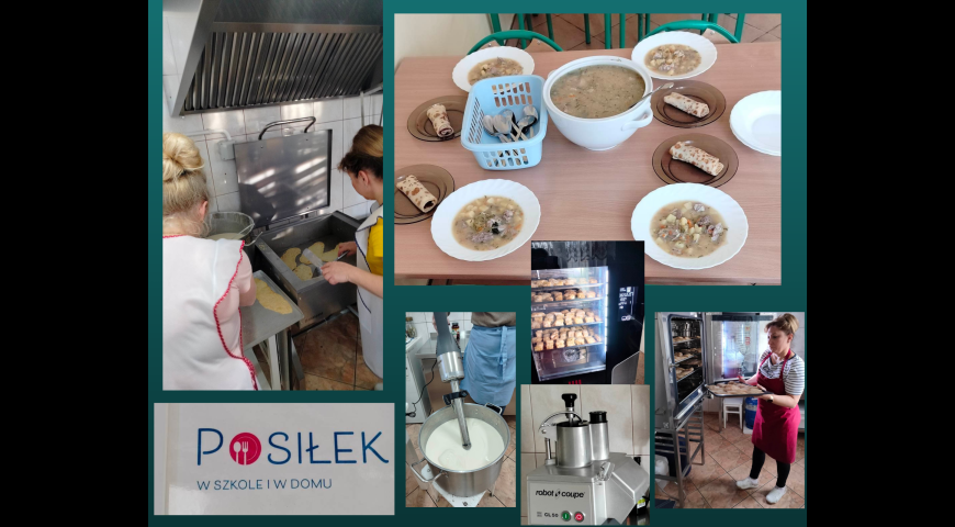 Oznacza to, że od września pracujemy na nowym sprzęcie. Najważniejsze sprzęty o jakie wzbogaciła się nasza placówka to piec konwekcyjno-parowy. Pozwala to na przygotowanie mięs, ryb z minimalnym użyciem tłuszczów (oleju). W skład nowego sprzętu wchodzą również nowa patelnia elektryczna, kuchnia gazowa na podstawie, taboret gazowy, szatkownica do warzyw, mikser ręczny z uchwytem, waga kuchenna oraz akcesoria kuchenne