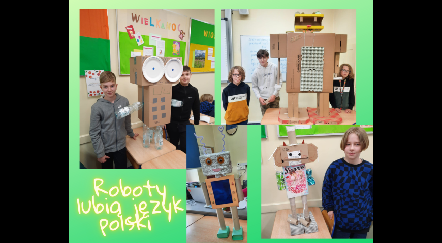 Roboty lubią język polski / Data publikacji: 16.03.23 / Dodane przez Magda Pogoda - 16.03.23 Tworzenie robotów na lekcji języka polskiego w klasie VIa.