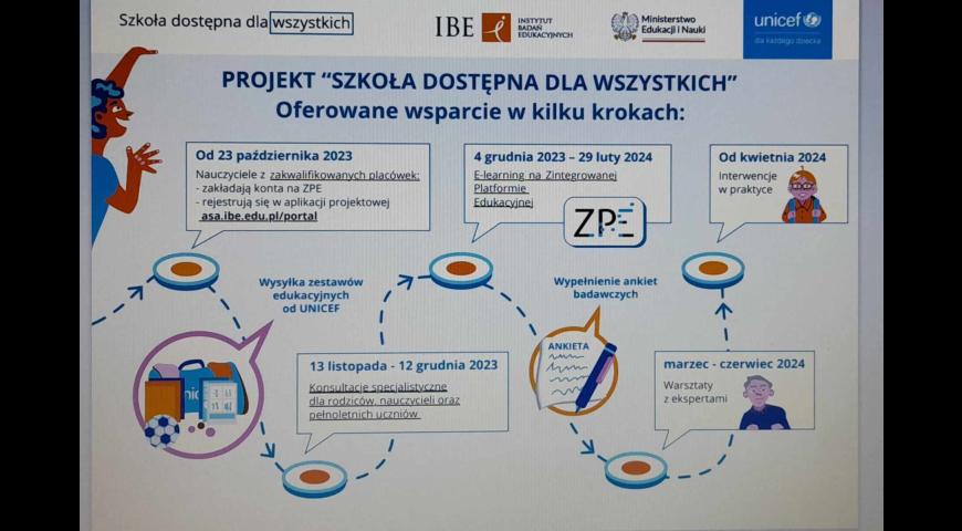 Jest nam niezmiernie miło poinformować, że nasza szkoła bierze udział w projekcie organizowanym przez Instytut Badań Edukacyjnych, UNICEF oraz Ministerstwo Edukacji i Nauki - "Szkoła dostępna dla wszystkich" (Accesssible School for All). W trakcie działań planowane jest dotarcie nawet do 30 tys. dzieci.