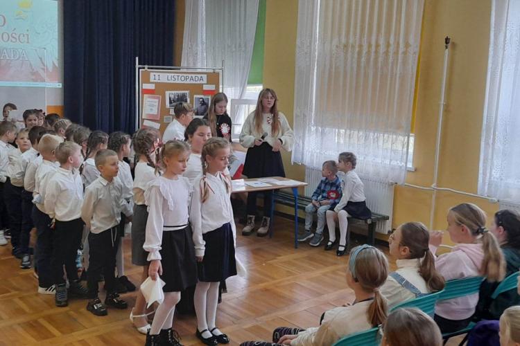 Szkolny projekt " Nasza niepodległa" trwał od 17 października do 10 listopada. W tym czasie na godzinach wychowawczych uczniowie wykonywali zadania: plakat, życzenia dla Polski, grali w kalambury poznając tradycje, postacie, zwyczaje, obrazy związane z Polską np: Pomarańczarka, arrasy, Wyczółkowski. Inna gra to - Miejsca Pospolitej. Uczniowie poznawali ważne miejsca dla historii Polski. 10 listopada na podsumowanie odbyło się przedstawienie - Święto Niepodległości. Występowali uczniowie klas 6-8 oraz uczniowie naszego oddziału przedszkolnego. Tańczyli uczniowie klasy 2b.