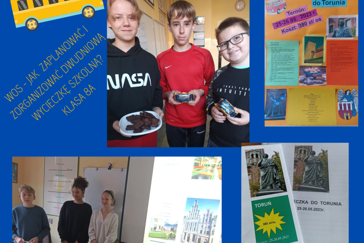 Zadanie projektowe podczas lekcji Wosu w klasie 8a oraz 8c. Zadaniem uczniów było przygotowanie dwudniowej wycieczki po naszym regionie, omówienie atrakcji, legend, przygotowanie kosztorysu i ulotek.