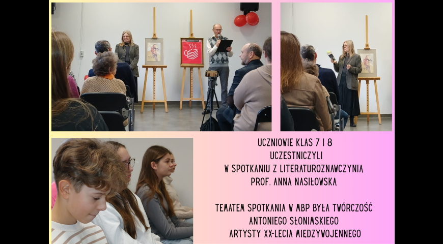 Uczniowie klas VII i VIII uczestniczyli w spotkaniu organizowanym przez Miejską Bibliotekę Publiczną na temat twórczości Antoniego Słonimskiego, artysty XX-lecia międzywojennego. Spotkanie prowadziła literaturoznawczyni prof. Anna Nasiłowska. Bardzo dziękujemy za zaproszenie.