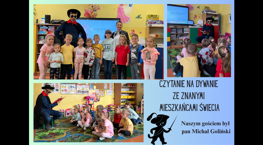 Podobnie jak w ubiegłym roku kontynuujemy cykl ,,Czytanie na dywanie ze znanymi mieszkańcami Świecia". Właśnie dziś oddział przedszkolny odwiedził pan Michał Goliński z Izby Regionalnej. Zachwycił dzieci pięknym strojem. Przebrał się za bohatera swojej ulubionej książki z dzieciństwa - Kota w butach. Serdecznie dziękujemy za wizytę:)