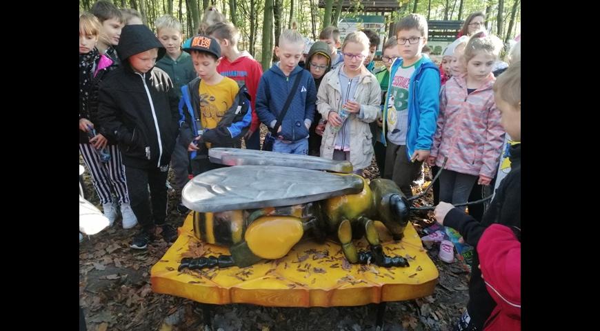 Uczniowie klas 3a i 3b wraz z wychowawcami wybrali się w lekcji przyrodniczej w Nadleśnictwie Dąbrowa. Podczas długiego spaceru przez las obserwowaliśmy przyrodę i zachodzące wczesną jesienią zmiany. Poznaliśmy warstwową budowę lasu. Rośliny rosnące w poszczególnych piętrach – rozpoznawaliśmy drzewa iglaste i liściaste. Udało nam się usłyszeć śpiew ptaków. Po spacerze spotkaliśmy się z myśliwym, który zaprezentował swój strój, zagrał na rogu i opowiedziała jak leśnicy pomagają zwierzętom podczas zimy. Po lekcji przyszedł czas na odpoczynek. Mogliśmy się wspólnie pobawić, wspinać, obserwować przyrodę i zjeść ze smakiem upieczone na ognisku kiełbaski. Piknik w lesie był bardzo udany. Pogoda i humor nam dopisały. Zmęczeni, ale uśmiechnięci wróciliśmy do szkoły. Nasze wesołe miny na zdjęciach świadczą o udanej wycieczce.