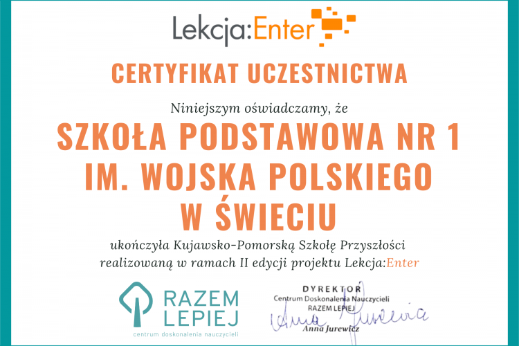 Szkoła realizuje działania w ramach projektu ,,Kierunek - Zawód", realizowanego przez Wojewódzki Urząd Pracy w Toruniu, współfinansowanego ze środków Unii Europejskiej w ramach Funduszy Europejskich. Celem projektu jest wsparcie uczniów w rozpoznawaniu ich predyspozycji, zainteresowań i potrzeb edukacyjnych oraz pomoc w świadomym wyborze szkoły ponadpodstawowej. Projekt skierowany jest do uczniów klas VIII. Dzięki udziałowi w projekcie szkoła została wyposażona w dodatkowe narzędzia i materiały dydaktyczne, które wspierają prowadzenie zajęć doradztwa zawodowego.