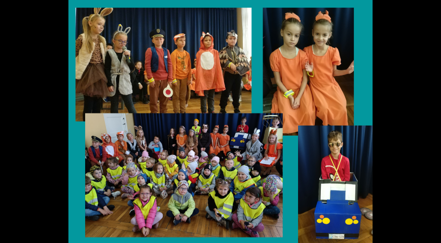 W czwartek 6 października gościliśmy w naszej szkole panów policjantów z Powiatowej Komendy Policji w Świeciu. Spotkanie rozpoczęło się od prezentacji przygotowanego przez uczniów klasy 2b przedstawienia teatralnego pt: "Bezpieczni w drodze do szkoły". Uczniowie przebrani za leśne zwierzęta przypomnieli młodszej społeczności szkolnej o potrzebie noszenia elementów odblaskowych. Po przedstawieniu panowie policjanci zapoznali uczniów 0-3 z podstawowymi zasadami bezpieczeństwa na drodze. Miło nam było również gościć tego dnia przedszkolaków z sąsiedniego przedszkola "Słoneczko" oraz uczniów ze Szkoły Podstawowej nr 2 w Świeciu. Życzymy wszystkim bezpiecznej drogi do szkoły i ze szkoły do domów.