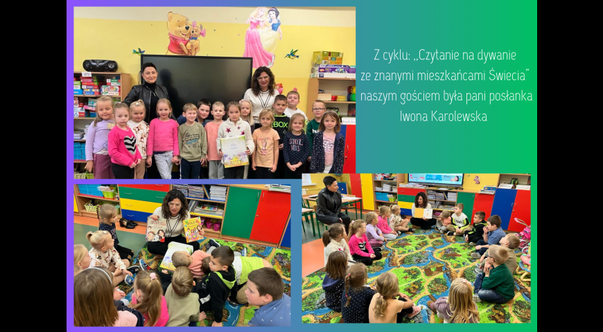 12 listopada do oddziału przedszkolnego w ramach projektu ,,Czytanie na dywanie ze znanymi mieszkańcami Świecia" zawitała pani posłanka Iwona Karolewska. Przeczytała Żaczkom książeczkę o przygodach Kubusia Puchatka, którą dzieci wysłuchały z wielkim zaciekawieniem, a następnie wywiązała się dyskusja na temat bajki oraz pracy pani Iwony w Sejmie. Serdecznie dziękujemy za odwiedziny.