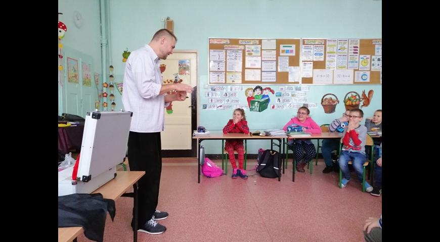 24 października nasza klasa 3b gościła iluzjonistę. W czasie występu zaprezentował nam kilka czarodziejskich trików. Jako asystentów zapraszał uczniów, którzy razem z nim wykonywali  „sztuczki”. Nasz gość pozostawił po sobie niezapomniane wrażenia i pokazał nam, że niemożliwe staje się możliwe. Pokaz magii i iluzji zachwycił wszystkich widzów.