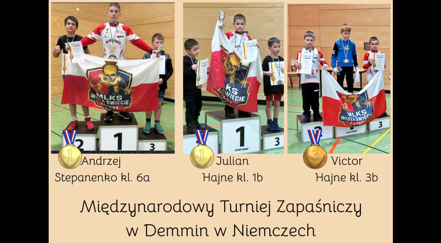 Z wielką radością informujemy o ogromnym sukcesie naszych uczniów, którzy brali udział w Międzynarodowym Turnieju Zapaśniczym w Demmin w Niemczech. Złote medale zdobyli Julian Hajne z klasy 1b oraz Andrzej Stepanenko z klasy 6a. Brązowy medal wywalczył Victor Hajne z klasy 3b.