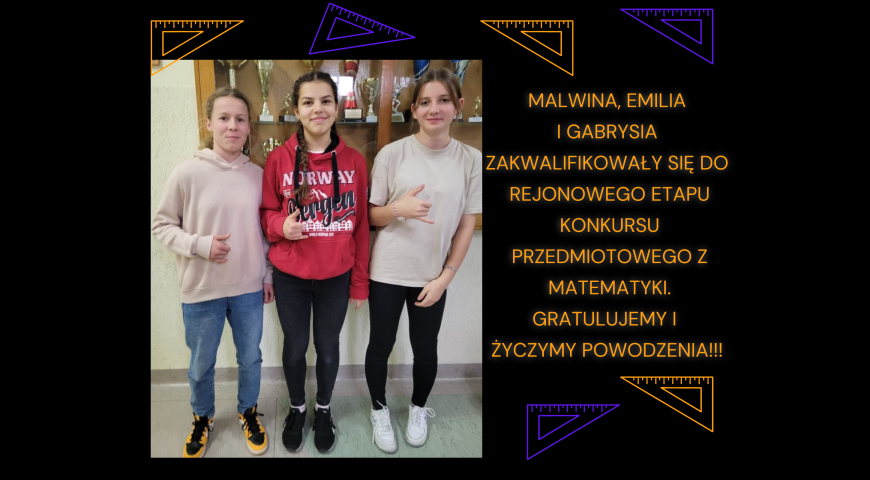 Malwina Słupska i Gabrysia Manikowska z klasy 8b oraz Emilia Pilińska z klasy 8e to nie tylko utalentowane sportsmenki. To również wspaniałe matematyczki. W Konkursie Przedmiotowym z Matematyki przekroczyły wymagany próg punktowy i zakwalifikowały się do etapu rejonowego. Serdecznie gratulujemy i życzymy dalszych sukcesów.