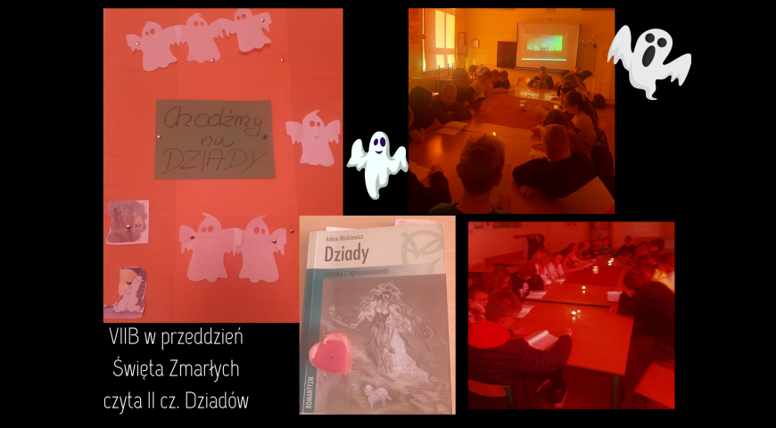 Klasa 7B w przeddzień Święta Zmarłych czyta II cz. Dziadów w ramach nietypowych i nieoczywistych lekcji języka polskiego.