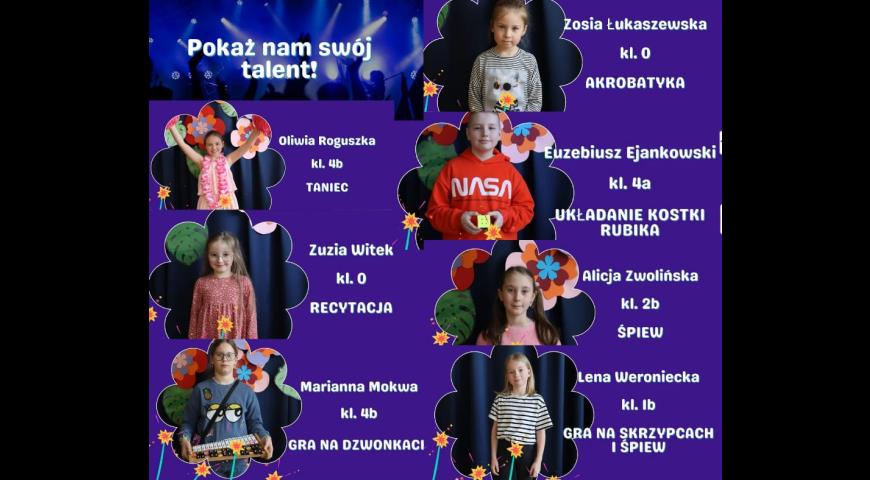 Podczas VI edycja Pokaż Nam Swój Talent wysłuchaliśmy recytacji w wykonaniu Zuzi Witek z Oddziału Przedszkolnego oraz śpiewu Alicji Zwolińskiej z klasy 2b. Grą na skrzypcach zachwyciła wszystkich Lena Weroniecka, uczennica klasy 1b. Na dzwonkach pięknie zagrała Mania Mokwa, reprezentantka klasy 4b, a Oliwia Roguszka (z tej samej klasy) zaprezentowała swoje umiejętności taneczne. Niezwykłe akrobacje w powietrzu wykonała Zosia Łukaszewska z Oddziału Przedszkolnego, a Ebi Ejankowski z klasy 4a udowodnił, że w niezwykłym tempie potrafi poradzić sobie z ułożeniem kostki Rubika.