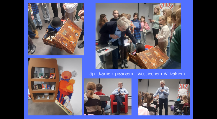 Uczniowie klas 4-6 naszej szkoły mieli ogromną przyjemność wziąć udział w spotkaniu z pisarzem Wojciechem Widłakiem. Organizatorem spotkania była Miejska Biblioteka. Pisarz przybliżył dzieciom tajniki powstawania książek oraz ilustracji do nich. Przeczytał również fragment swojej powieści "Dwa serca anioła", którym wzruszył zgromadzoną publikę. Dzieci mogły zadawać pytania, na które autor "Pana Kuleczki" chętnie odpowiadał. Na koniec dzieci miały możliwość otrzymania autografów.
