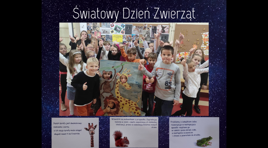 Miesiąc październik poświęcony jest trosce o zwierzęta, w związku z tym 6 października obchodziliśmy ich święto. Drzwi poszczególnych sal zostały upiększone przez portrety zwierząt. Na korytarzach można było zapoznać się z ciekawostkami ze świata zwierząt. Natomiast na parterze powstała galeria z fotografiami i portretami naszych czworonożnych (i nie tylko) przyjaciół. Na koniec można było sobie zrobić zdjęcie w zwierzęcej fotobudce