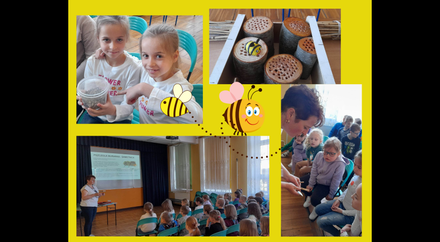 4 maja uczniowie klasy 2a i 2b uczestniczyli w lekcji otwartej na temat owadów zapylających. Dzieci miały okazję zobaczyć na żywo pszczoły murarki oraz dowiedzieć się ciekawostek o ich życiu. Po części teoretycznej wszyscy ochoczo zabrali się do budowania z trzciny, szyszek i drewna hoteli dla owadów oraz papierowych pszczółek. W trakcie warsztatów powstało 5 hoteli oraz ciekawa, kolorowa gazetka o pszczołach.