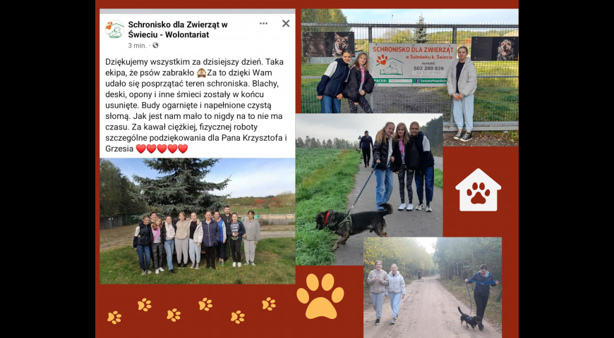 Wizyta w schronisku / Data publikacji: 08.10.22 / Dodane przez Magda Pogoda - 08.10.22 Sobotni poranek uczennice ze Szkolnego Wolontariatu spędziły w towarzystwie psiaków ze świeckiego schroniska. To był pięknie spędzony czas.