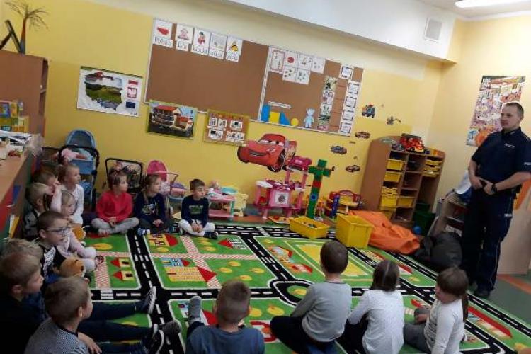 Wizyta policjanta w oddziale przedszkolnym oraz klasach pierwszych.