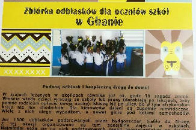 W krajach leżących w okolicach równika już około godziny 18:00 zapada zmrok. Właśnie wtedy dzieci wracają ze szkoły lub pracy - dorabiają po lekcjach, żeby pomóc rodzicom opłacić swoją naukę. Muszą iść po ulicy, bo w tym afrykańskim kraju nie ma chodników. Dla kierowców są zupełnie niewidoczne. Wiele z nich ulega wypadkom, a nawet ginie pod kołami samochodów. Chcąc zapewnić dzieciom z Ghany bezpieczną drogę do domu, nasza szkoła dołączyła do akcji zbierania odblasków. Liczymy na Wasze zaangażowanie.