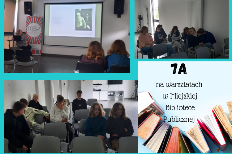 Klasa VIIa na warsztatach w MBP. Uczniowie obejrzeli prezentację na temat problemów wieku dorastania. Prowadząca spotkanie, p. Anna Mokwa, zachęcała młodych ludzi do rozmów z dorosłymi. Przekonywała, że warto być osobą wrażliwą, która pielęgnuje w sobie empatię wobec świata i innych ludzi.