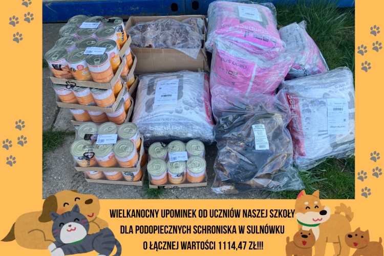 Połączyliśmy środki z kiermaszu ,,Babeczki z Jedyneczki" z okazji Dnia Kobiet oraz Charytatywnej Loterii Wielkanocnej i po konsultacji z wolontariuszami ze schroniska w Sulnówku zakupiliśmy produkty dla podopiecznych schroniska o łącznej wartości 1114 zł i 47gr. Dziękujemy całej społeczności szkolnej za wsparcie akcji.