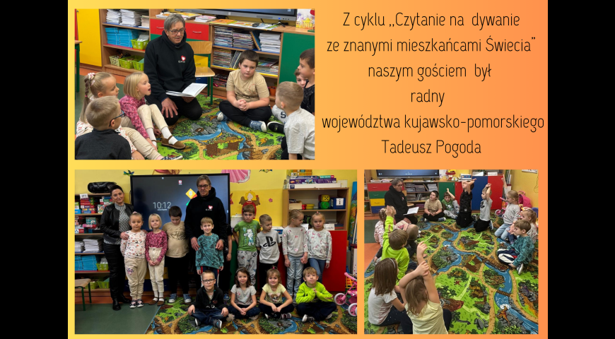 Kolejnym gościem, który odwiedził oddział przedszkolny w ramach cyklu ,,Czytanie na dywanie ze znanymi mieszkańcami Świecia" był radny województwa kujawsko-pomorskiego i były burmistrz naszego miasta pan Tadeusz Pogoda. Zapoznał Żaczki z historią pieska Czarusia i jego opiekunki. Nawiązała się dyskusja na temat domowych zwierzątek, sprawowania nad nimi opieki, a także odpowiedzialności jaka ciąży na opiekunach. Dziękujemy za odwiedziny.