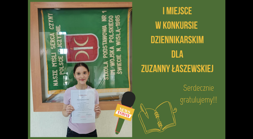 Uczennica klasy 8b Zuzanna Łaszewska zajęła 1. miejsce w IX Powiatowym Konkursie Dziennikarskim pod honorowym patronatem Kujawsko -Pomorskiego Kuratora Oświaty, organizowanym przez I Liceum Ogólnokształcące im. Floriana Ceynowy w Świeciu.
