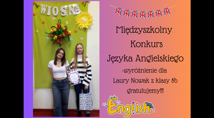 18 marca 2024 roku w Szkole Podstawowej nr 8 odbył się Międzyszkolny Konkurs z Języka Angielskiego. Naszą szkołę reprezentowały uczennice klasy 8b: Amelia Redmann oraz Laura Nowak, która otrzymała wyróżnienie. Gratulujemy!!!