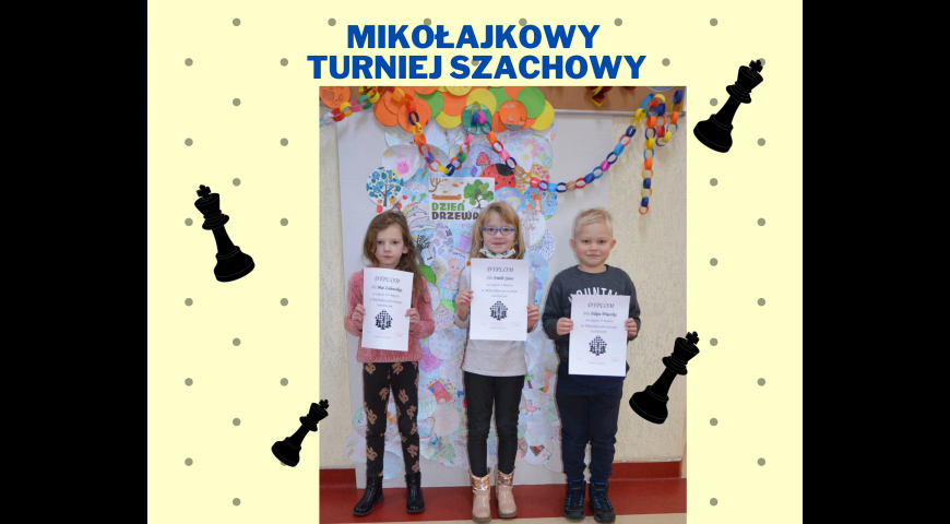 Mikołajkowy turniej szachowy / Data publikacji: 06.12.21 / Dodane przez Magda Pogoda - 06.12.21 W mikołajkowym turnieju szachowym I miejsce zajęła Emilia Janos II miejsce zajął Filip Wiączek III miejsce zajęła Maja Zalewska Gratulujemy