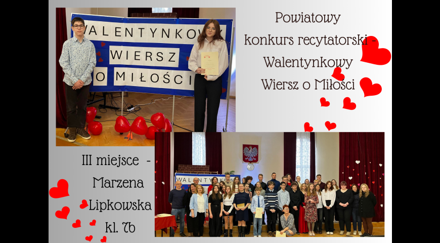 Z okazji Walentynek I Liceum Ogólnokształcące im. Floriana Ceynowy zorganizowało powiatowy konkurs recytatorski - Walentynkowy Wiersz o Miłości. Uczniowie szkół podstawowych oraz średnich zmagali się z tekstami polskich poetów. Naszą szkołę reprezentowali: Witold Krzyżanowski oraz Marzena Lipkowska z klasy 7b. Mamy zaszczyt ogłosić, iż Marzena zajęła III miejsce w kategorii szkół podstawowych. Serdecznie gratulujemy!!!