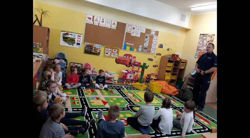 Wizyta policjanta w oddziale przedszkolnym oraz klasach pierwszych.